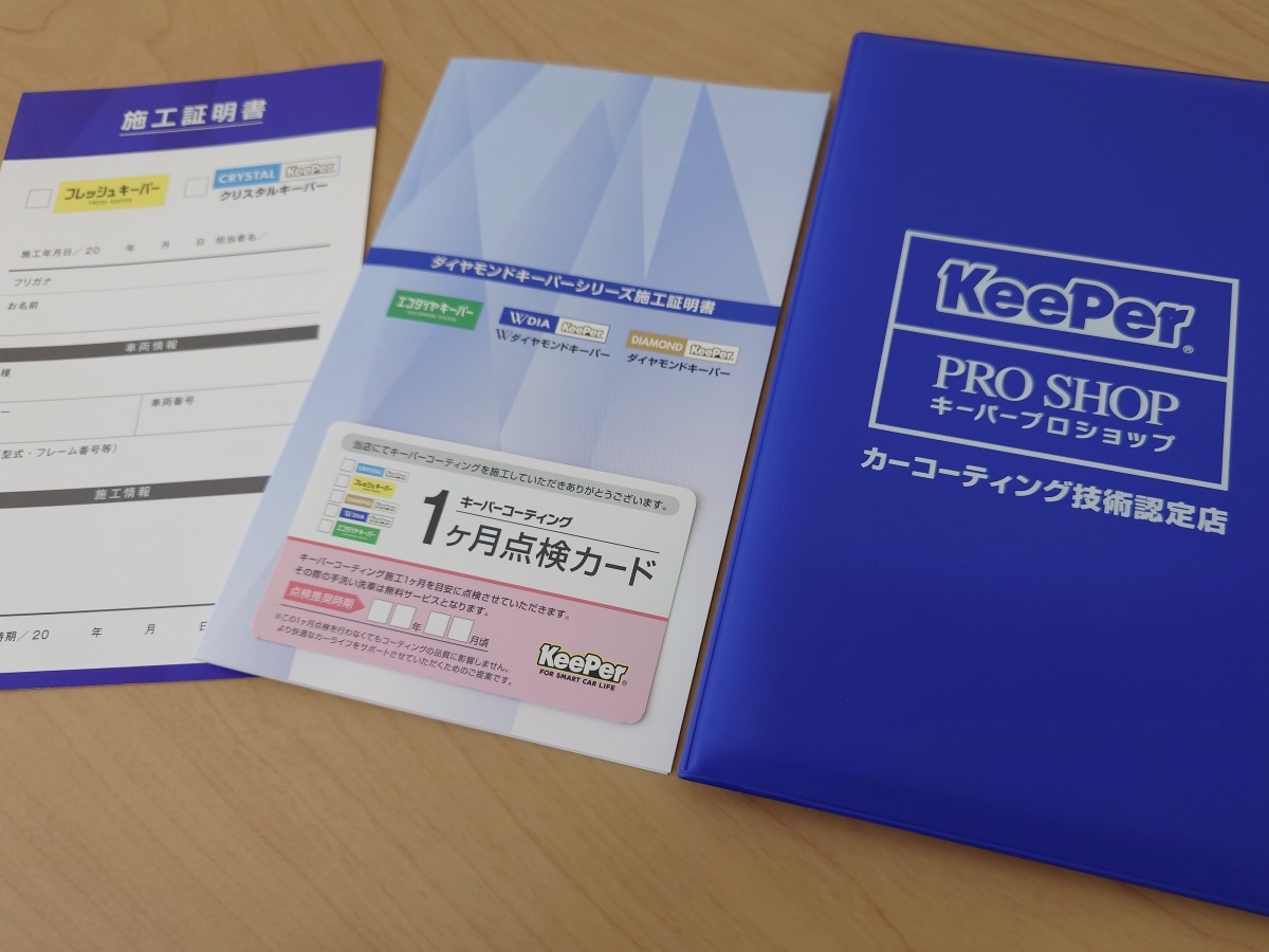 また、当店ではコーティングの施工証明書を発行しております。万が一お車を板金修理などされる場合の再施工(部分施工)が各種自動車保険の適用になる場合がございます。大切に保管してください。