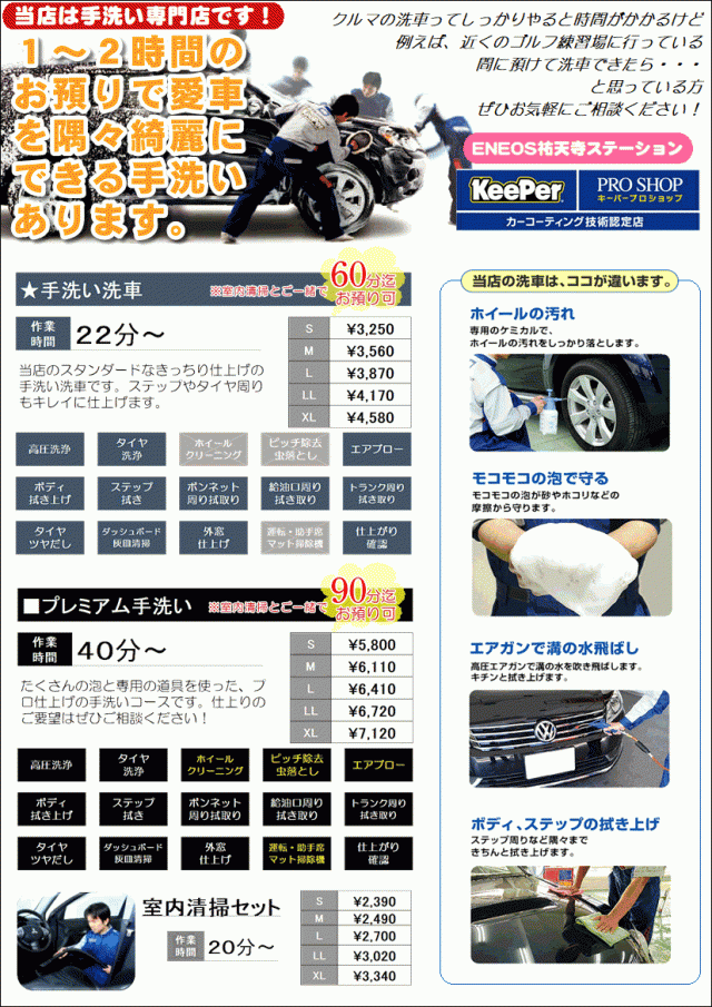 洗車やコーティングのほかにお車の車検やぶつけてしまった時の鈑金塗装、保険対応