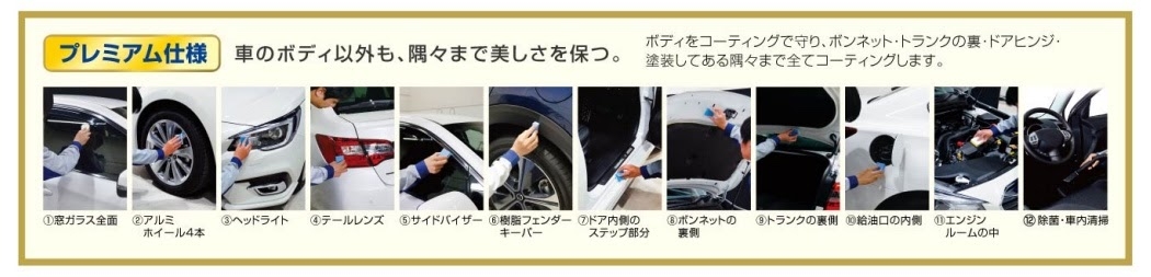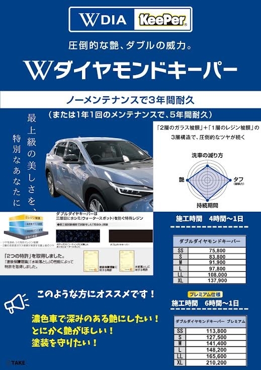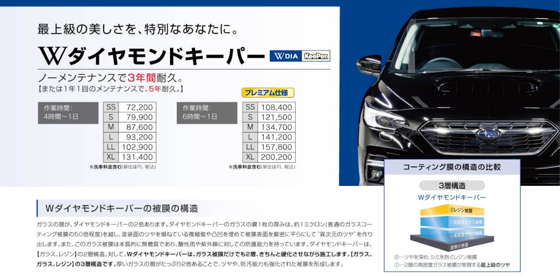 ボディを3層構造のダブルダイヤキーパーで守り、ボンネット、トランクの裏、ドアヒンジ、塗装してある部分を全てコーティングします。