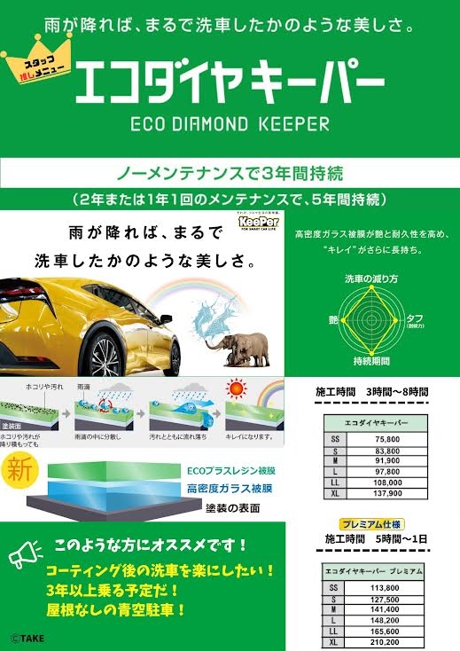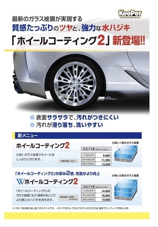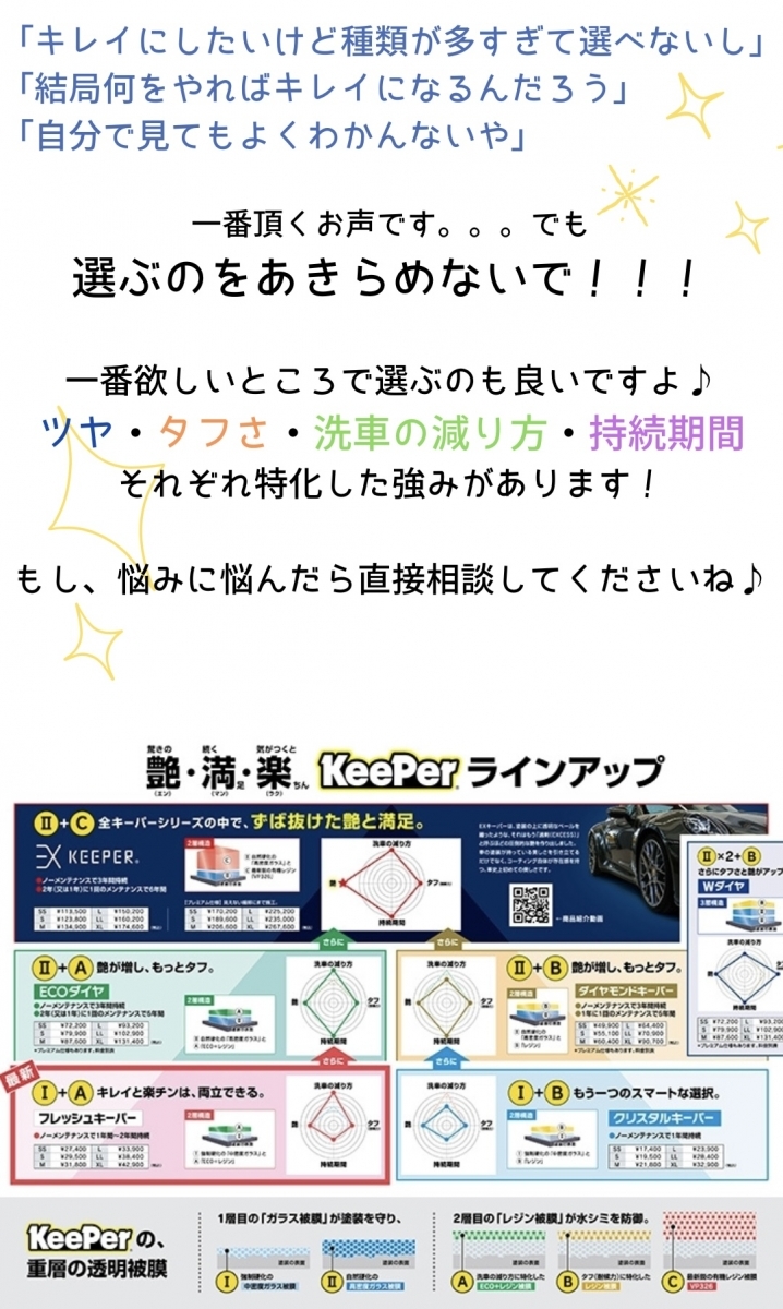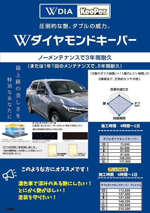 Wダイヤモンドキーパーはダイヤモンドキーパーの2倍のガラス層で“異次元のツヤ”を作り出します。酸性雨や紫外線に対しての防護能力も強化されたコーティングです!