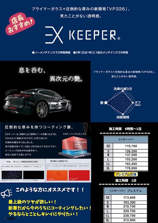 EXキーパーは塗装の上に透明なベールを纏ったような、それはもう「過剰(EXCESS)」と呼ぶほどの圧倒的な艶を作り出します。車の塗装が持っている美しさを引き立てるだけでなく、コーティング自体が存在感を持つ、車史上初めての美しさです。