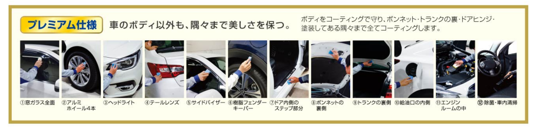 窓ガラスやホイールなどのオプションに加え、ドア内側のステップ部分やトランクの裏など塗装部分を隅々までコーティングします。