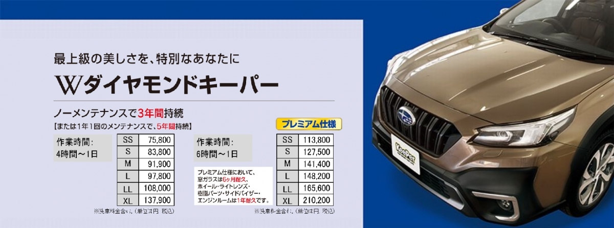 プレミアム仕様において、窓ガラスは6ヶ月耐久、ホイール・ライトレンズ・樹脂パーツ・サイドバイザー・エンジンルームは1年耐久です。