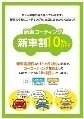 新車登録から12か月以内にボディコーティングをご用命のお客様は10%OFFにて施工が可能です!!ぜひご利用ください。