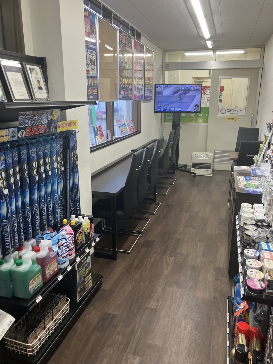 手洗い洗車やタイヤ交換、オイル交換、などでお待ちになる場合は待合室でゆっくりお過ごしください♪ 喫煙室は奥の扉を開けるとございます。