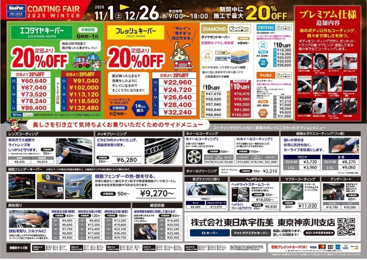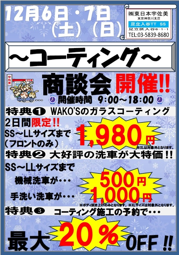 ☆お知らせ☆ COATING FAIR*WINTER 11月1日~12月26日 期間中に施工で最大20%OFF ご不明点等ございましたらお気軽に当店スタッフまで♪