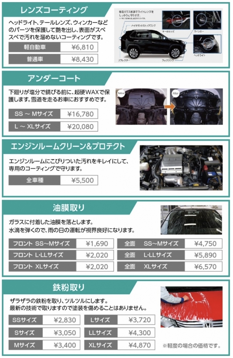 対応可能汚れ:花粉 黄砂 塩カル 融雪剤 海風 潮風樹液 鳥の糞 虫取り