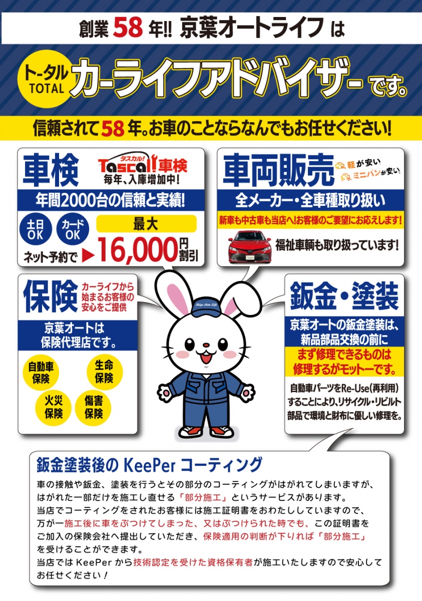 - 当店では、国の認可を受けた自社整備工場にて年間1800台の車検を行っています。スタッフは、国家資格を取得した専門知識豊富なプロの整備士でありKeeper技術認定取得者です。創業以来50年以上にわたり江戸川区・葛飾区の皆様より信頼とご愛顧を頂いております。