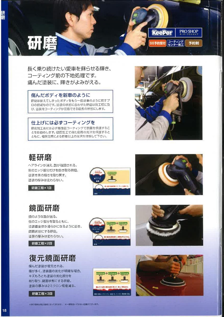 キズのエッジ部分を取るとともに、塗装面全体が滑らかになるように磨き、 鏡面状態にする研磨。塗装の厚みはほぼ変わらない。※濃色車にお勧め!