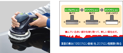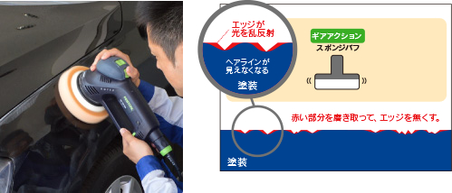 キズのエッジ部分だけを磨き取る研磨。 塗装本来の輝きを取り戻す。塗装の厚みは変わらない。
