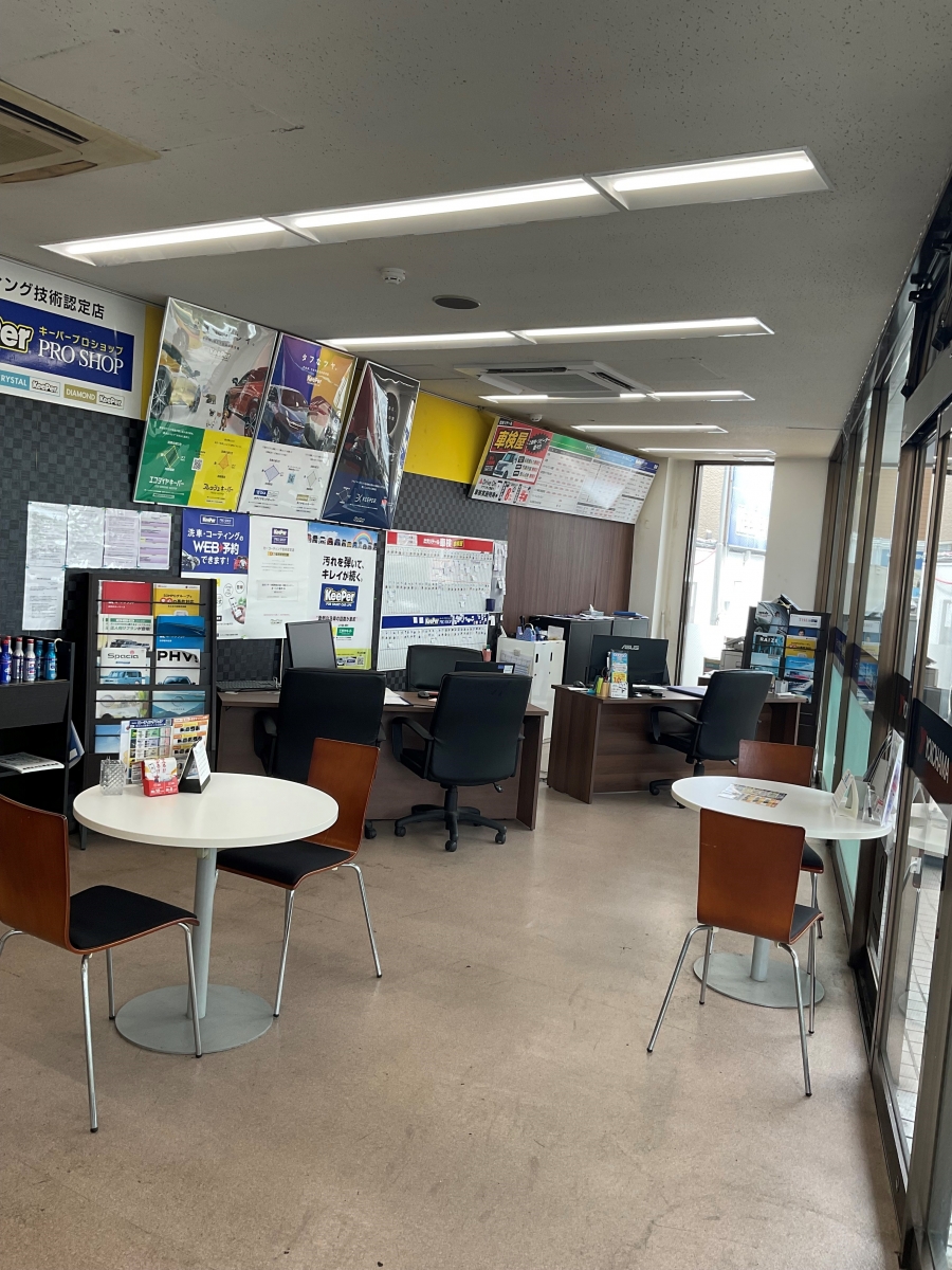 洗車・コーティング作業、お待ちの間は店内ショップルームにておくつろぎ下さい。