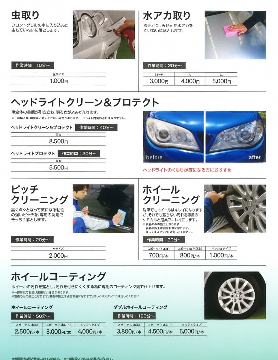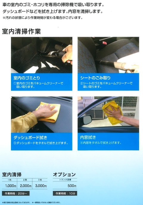 ・手洗い洗車、室内清掃、アラカルト(メニュー豊富)