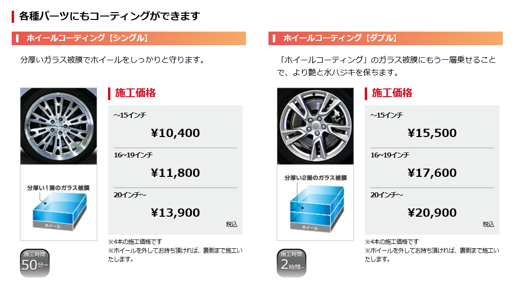 トランク・ボンネットの裏・ドアの裏・外から見えない塗装がされているあらゆる部分にエコダイヤキーパーを施工します。さらに、超撥水ウインドウガラスコーティング・ホイールコーティング・無塗装樹脂パーツキーパー・車内清掃が付くプラン!!