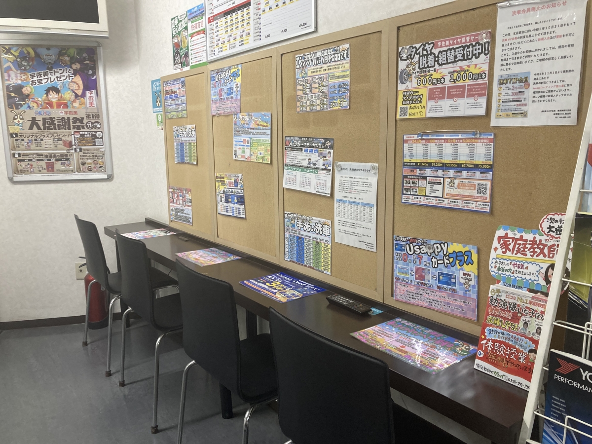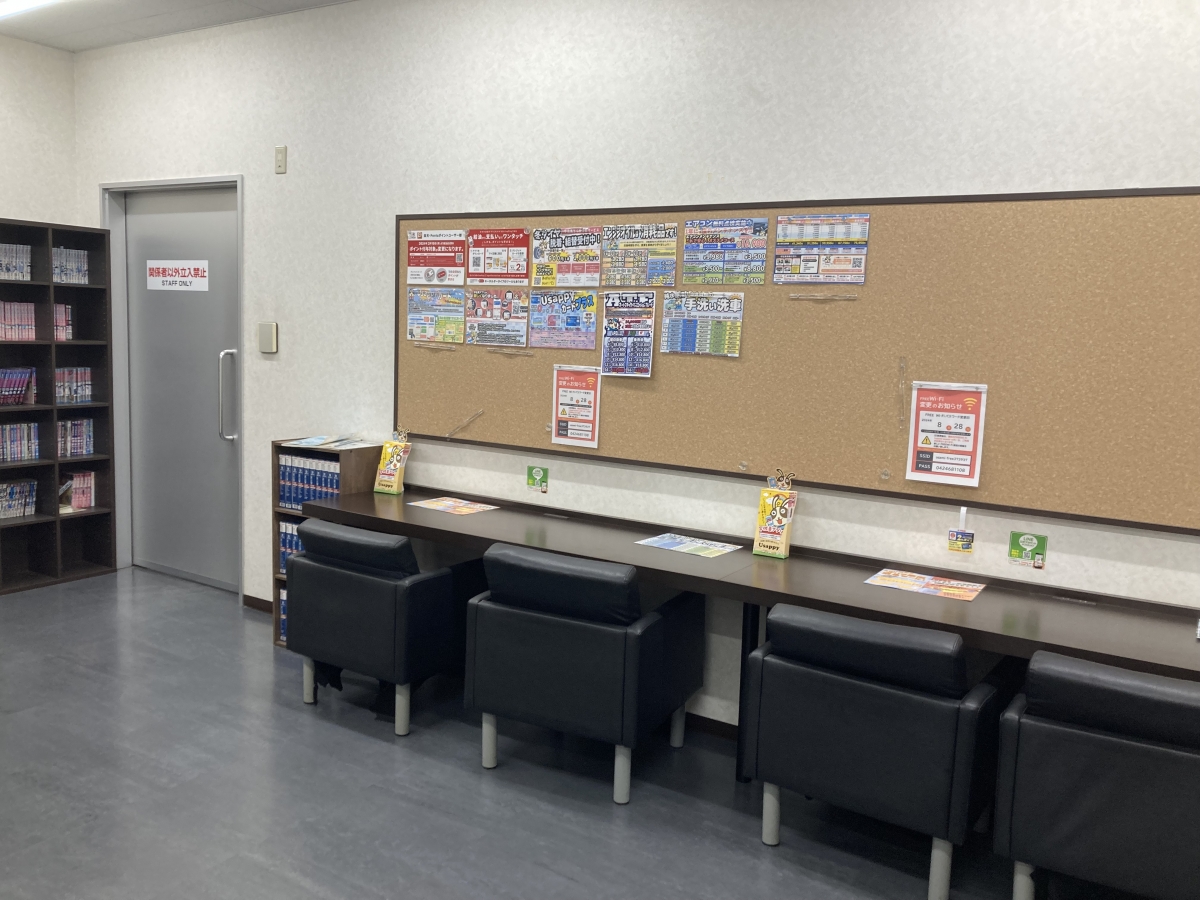 1回のサービスルームです。飲み物自動販売機・テレビ、Wi-Fi、完備してありますので、 待ち時間中のスマホ・タブレットの充電に最適。快適にお過ごし頂けます!