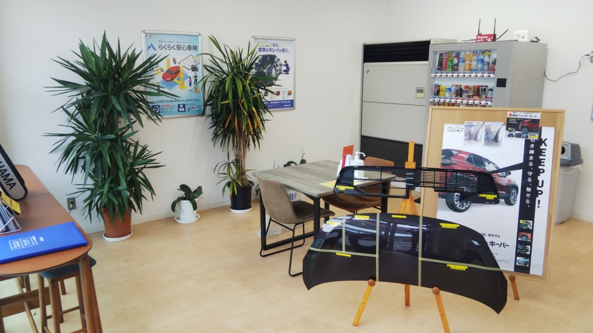 愛車が綺麗になるまでの時間をゆっくりお過ごしいただけれるよう落ち着いた雰囲気の待合室です。
