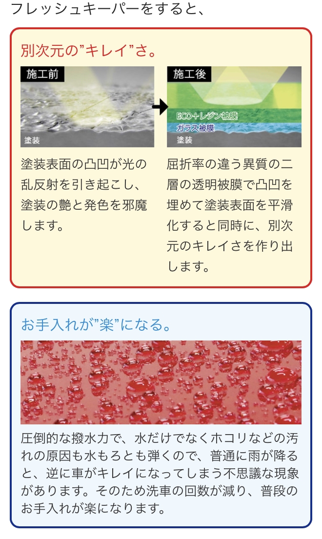 こんばんは!今日は久々の天気でしたが、空気は冷たかったですね〜今回はフレッシュキーパー!前回の施工からもう一年が経ったと思うとあっという間ですね〜艶とツルツルが復活しました!これで雨や雪が降っても安心...
