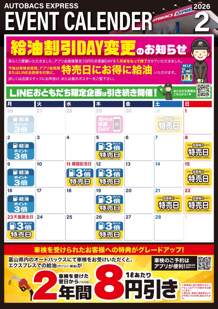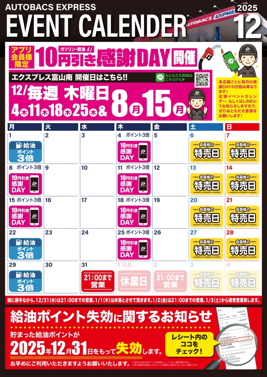 来月12分のイベントカレンダーが完成いたしました。ティッシュプレゼント企画も盛り込んであります!是非、ご利用ください。12月末で一部の給油ポイント失効してしまう場合があります。レシートでご確認いただき...