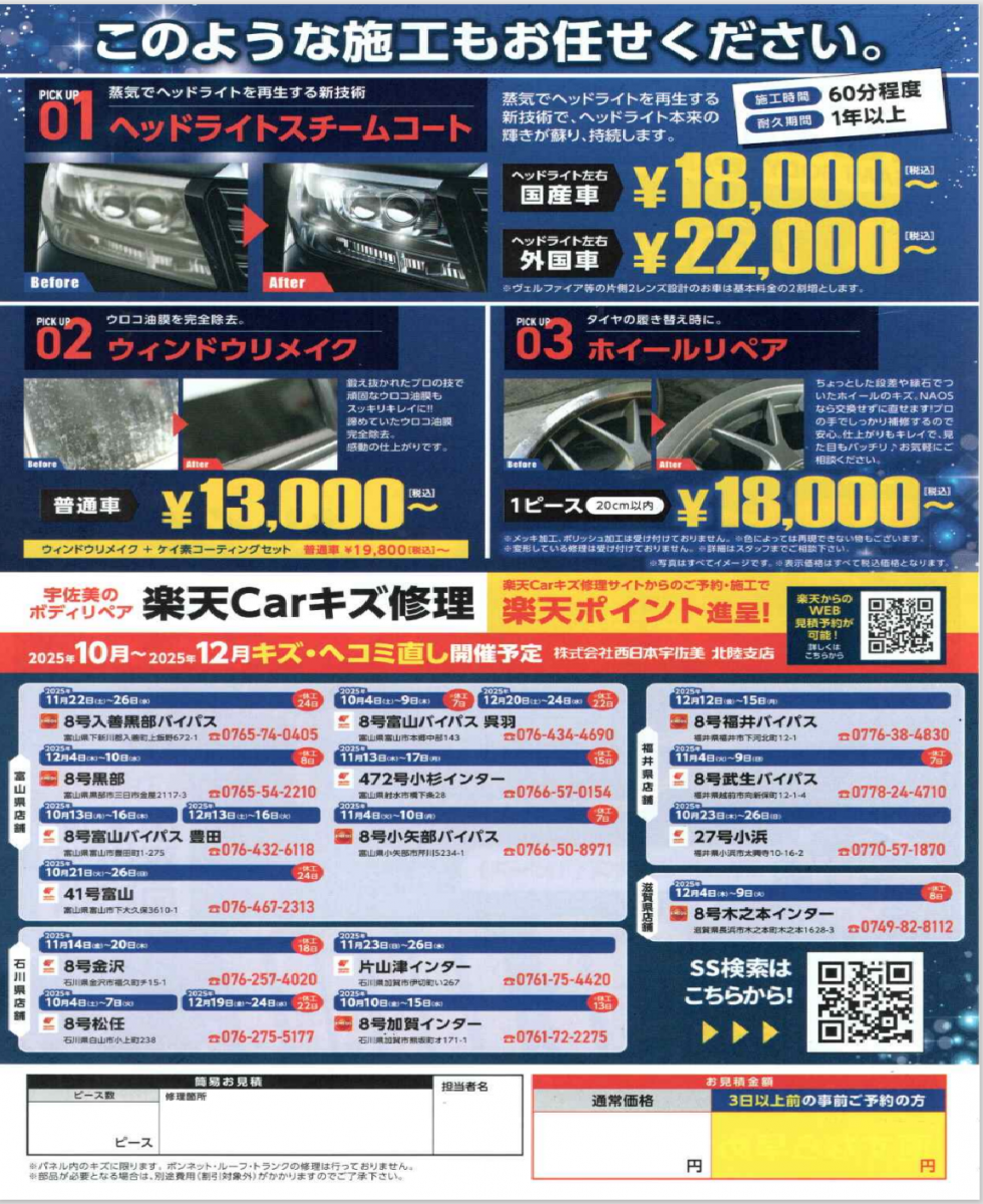 いつも宇佐美呉羽店のHPを観覧していただきありがとうございます。宇佐美呉羽店では10月4日(土)~9日(日)にリペア(板金塗装)のイベントを開催いたします。お車の気になるキズ・ヘコミなどありましたらお...