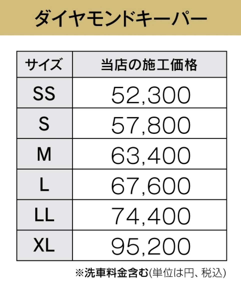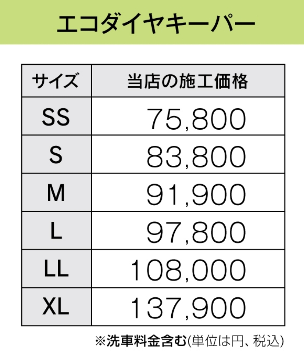 キーパーコーティングは、新車にかけると新車よりもっと光ります。すでにお乗りの愛車も、新車のようによみがえります。 コーティングした後は、お好きな時に洗っていただくだけで、ずっとキレイが続きます。 ご自身にピッタリのコーティングをご検討される中で、1つの目安として、ご覧ください。 ご不明なことは、スタッフまでお声掛けください。