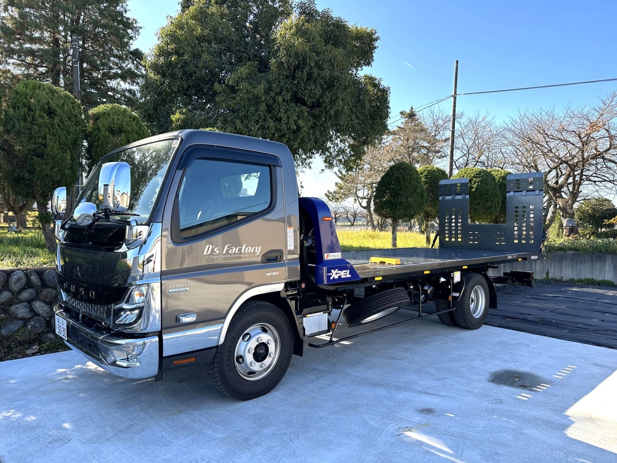 代車を無料でお貸出ししております。また、フルフラット積載車を保有しておりますのでご予約いただければお客様のご自宅やお勤め先へのお車の引き取り納車も可能です!(フルフラットですので車高の低いお車もOKです!)