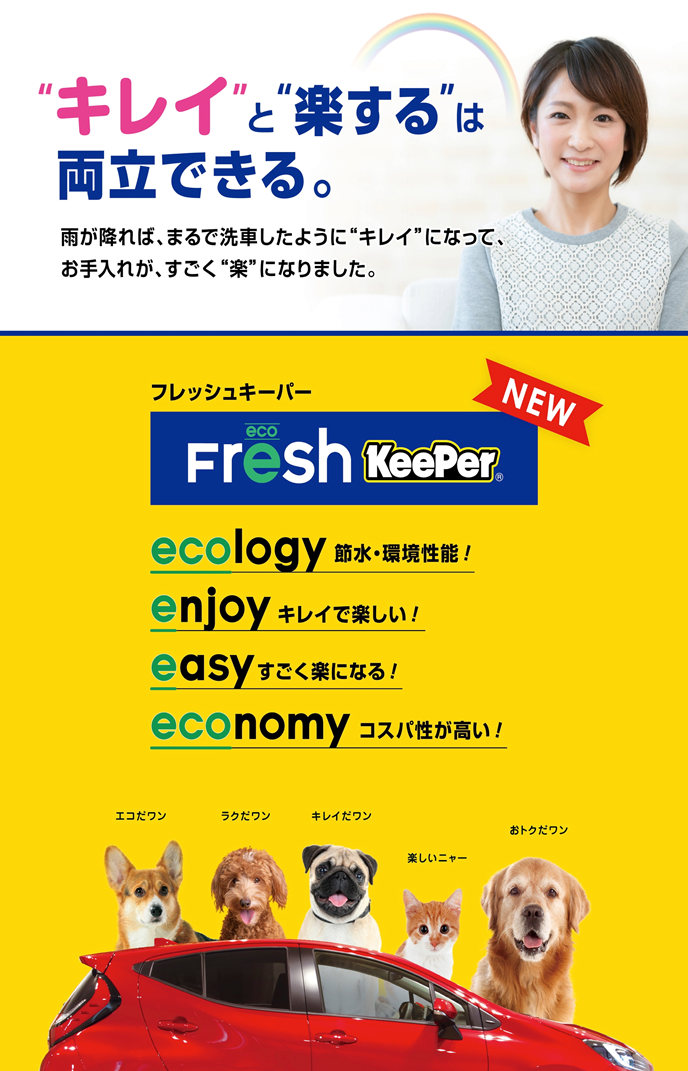フレッシュキーパーは、汚れの密着を防ぐ特殊な防汚能力を持ち、ホコリが降り積もっても塗装表面には密着せず、自然の雨が降れば元々持っている撥水力で、雨と一緒に汚れが流れ落ち、まるで洗車をしたようにキレイになります。
