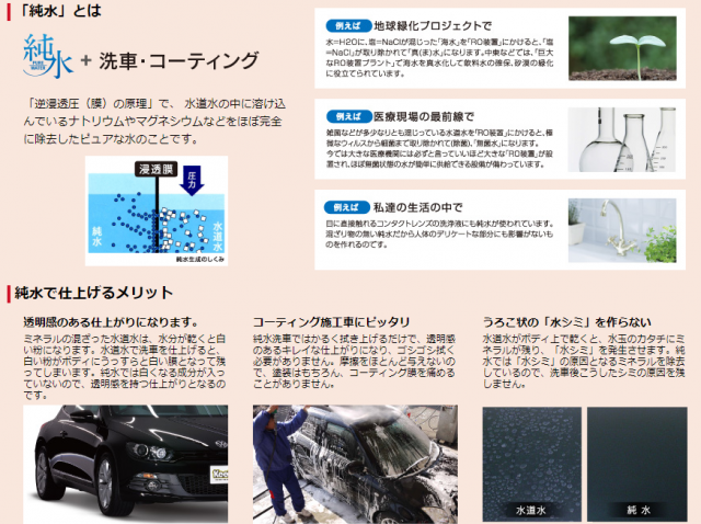 純水は水分が蒸発しても何も残りません また純水の使用で洗車やコーティングの「品質」が一段とあがります