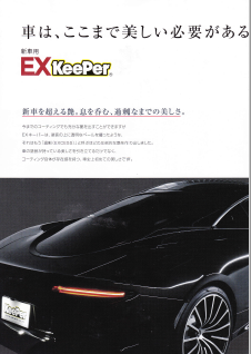 新商品 新車用 EXキーパー 効果は、触ってわかる! 新車を超える艶。息を?む、過剰なまでの美しさ。 圧倒的な厚みを持つコーティング被膜。 汚れさえはじく、驚くほど強力な、はっ水力で車が汚れない。 詳しくは、カタログをクリック!