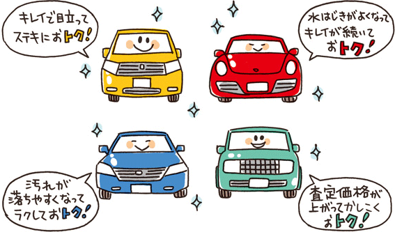 カーコーティングをすると車の塗装が傷みにくく、長く乗ってもツヤツヤのボディを楽しむ事が出来るのはその為です。艶の良いキレイな車ほど高額査定されます。そういう意味でカーコーティングは車の価値を守る。と言われています。