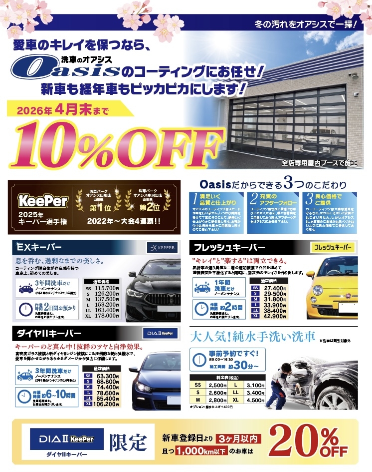 ダイヤ、Wダイヤ、エコダイヤ、ダイヤ2キーパーが20%OFFでご利用頂けます!新車施工時に大人気のコーティングです。