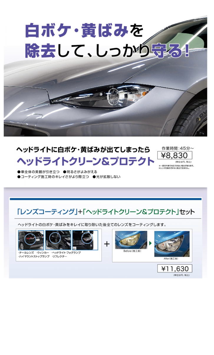 コーティングをかけるタイミングは新車時がベストです。新車の美しさをしっかり保護し、更に上質な艶と強撥水がお車を包み込みます。ぜひ一度ご体感下さい。