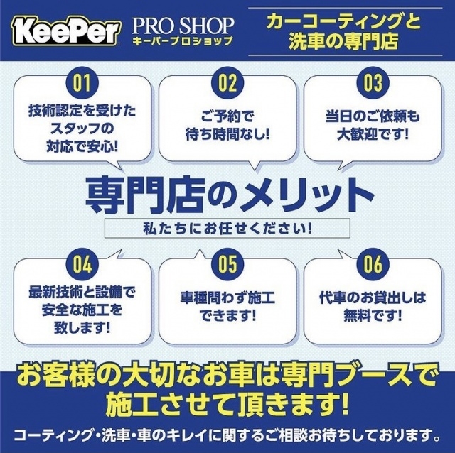 お車のキレイはぜひ当店へお任せ下さい。キーパー技術コンテスト入賞スタッフ在籍しております。