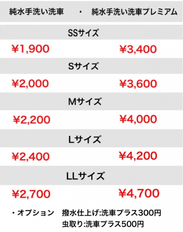 純水手洗い洗車メニュー