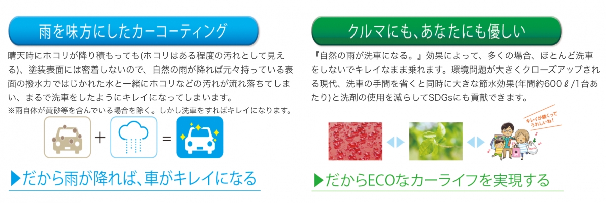"汚れ"の密着を防ぐ独特な防汚能力を持ち、ホコリが降り積もっても、塗装表面には密着せず、自然の雨が降れば、元々持っている撥水力で弾かれた水と一緒に、ホコリなどの汚れが落ち、 まるで洗車をしたようにキレイになります。