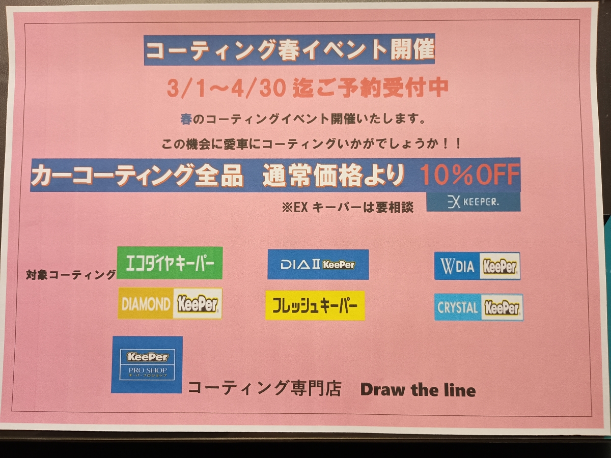 期間中ボディコーティング10%OFF致します。3・4月は予約が埋まる可能性もありますので、希望日ございましたら早めの予約をお勧めいたします