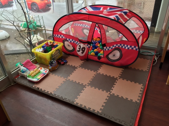 お子様が退屈されないようにキッズコーナーも設置してあります。テント型ボールプール・ブロック遊びなどがあります。ご自由にお使いください!!