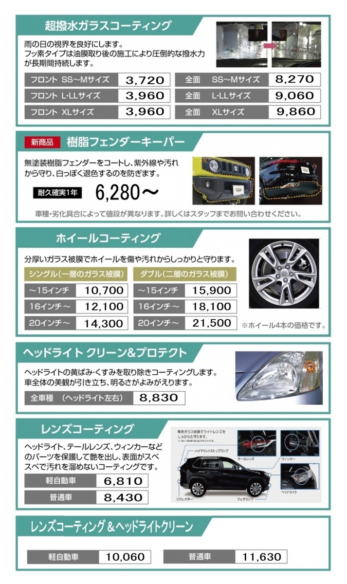 コーティング、手洗い洗車は予約制となっております。お電話での受付は0234-26-2484までお願いします。