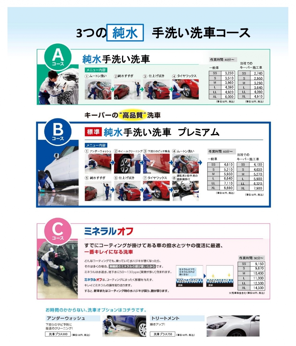 純水を使って洗車する事で、水道水に含まれるミネラル分や不純物により起こる水滴跡や水シミを避け、車をキレイに洗えます。また、当店の手洗い洗車は「ムース(泡)手洗い洗車」です。この泡は洗浄力の為のシャンプーではなく、クッションとすべり剤の役割を果たす泡で、やさしくお車を守りながら洗います。「シャンプー禁止コーティング車」も対応となっておりますので、安心してお任せください!