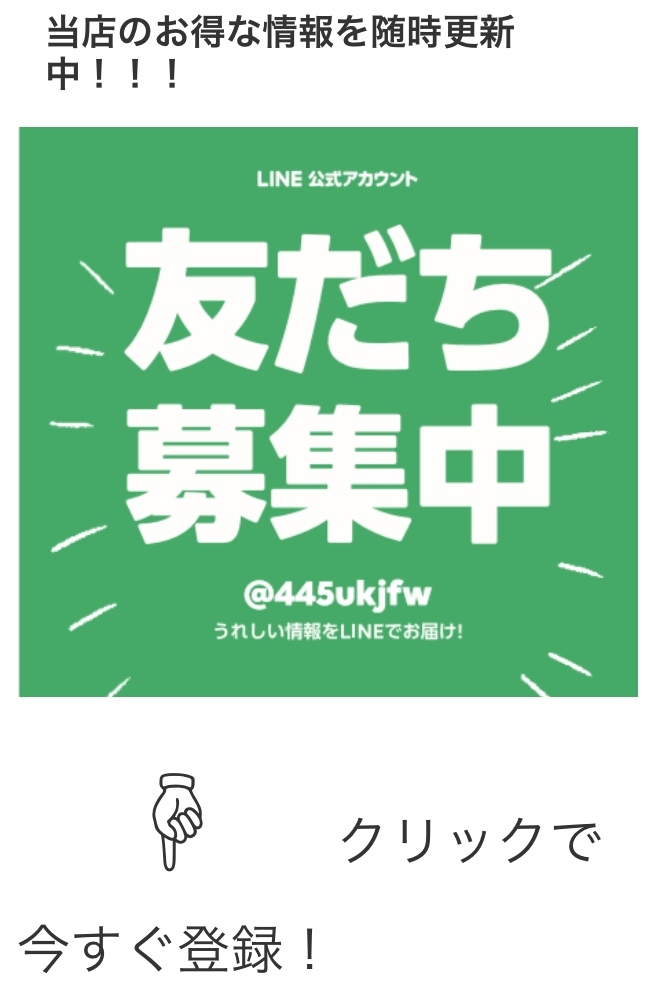 下のボタンから当店の公式LINE お友達追加してもらうと… お得な情報・クーポンがもらえちゃう! ↓ぜひ登録お待ちしてます↓