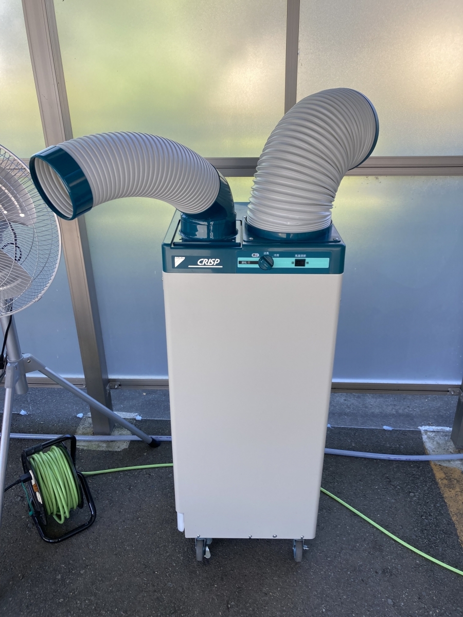 また、冷暖房も完備しており、夏場の気温上昇時には、スポットクーラーにて車の塗装温度上昇を抑え、コーティングを適切な温度で施工しています。