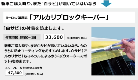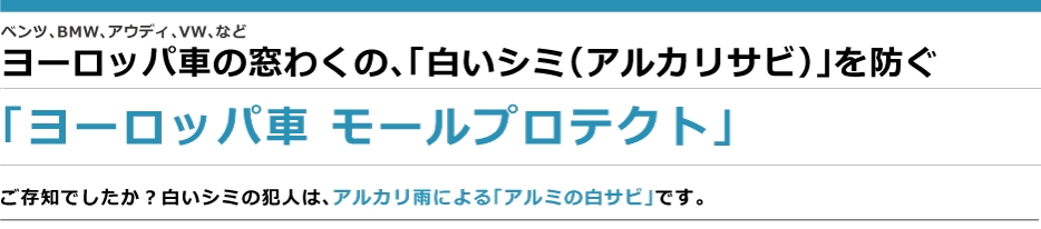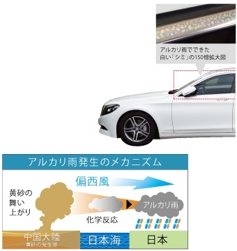 ヨーロッパで降る「酸性雨」には大変強いのですが、日本では中国のゴビ砂漠や、 タクラマカン砂漠から発生する「黄砂」が偏西風に乗ってやってきます。この「黄砂」は、ほぼケイ酸塩鉱物であり、水に溶けるとアルカリ性の「アルカリ雨」となり、ヨーロッパ車のアルミ合金のモールを白くサビさせてしまうのです。