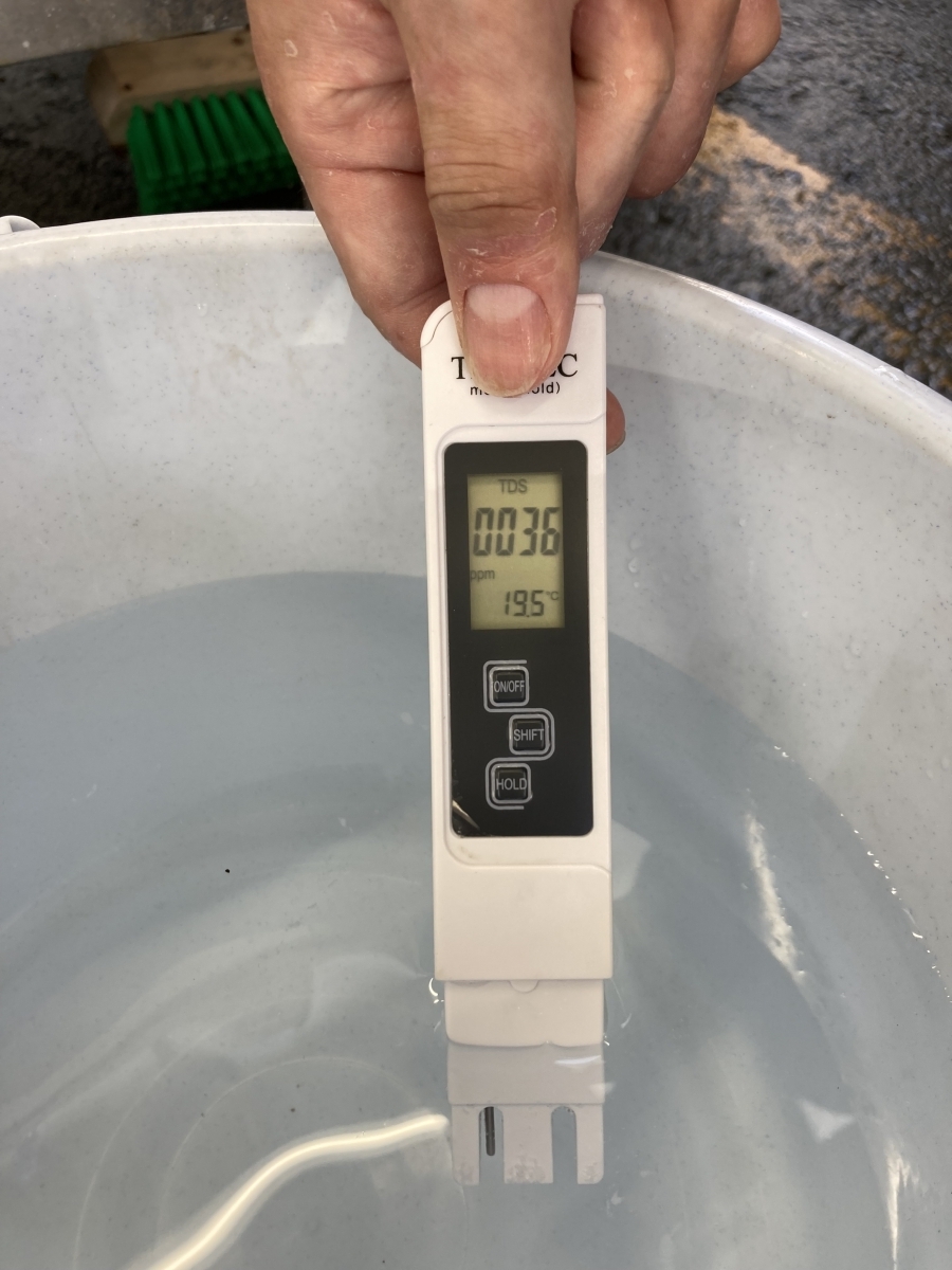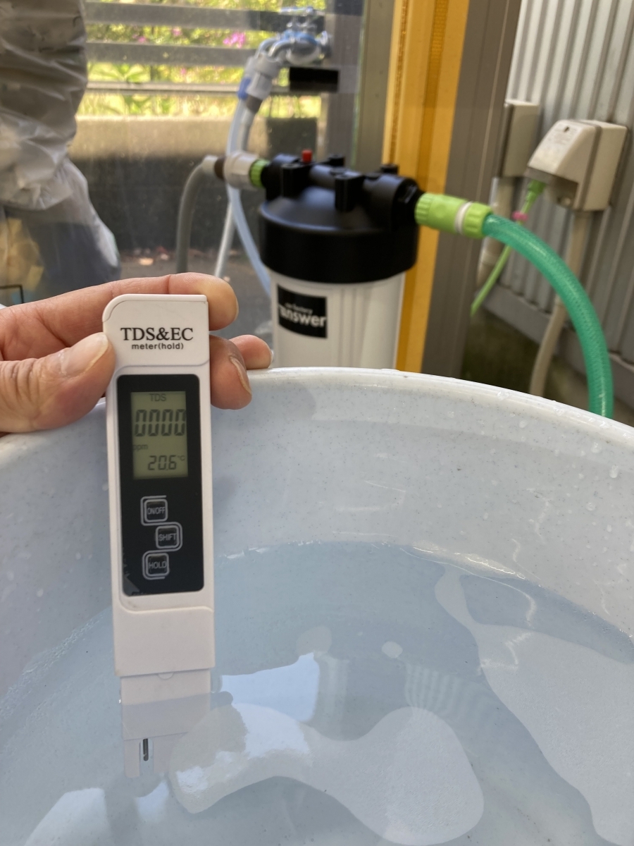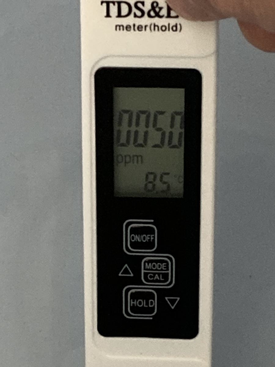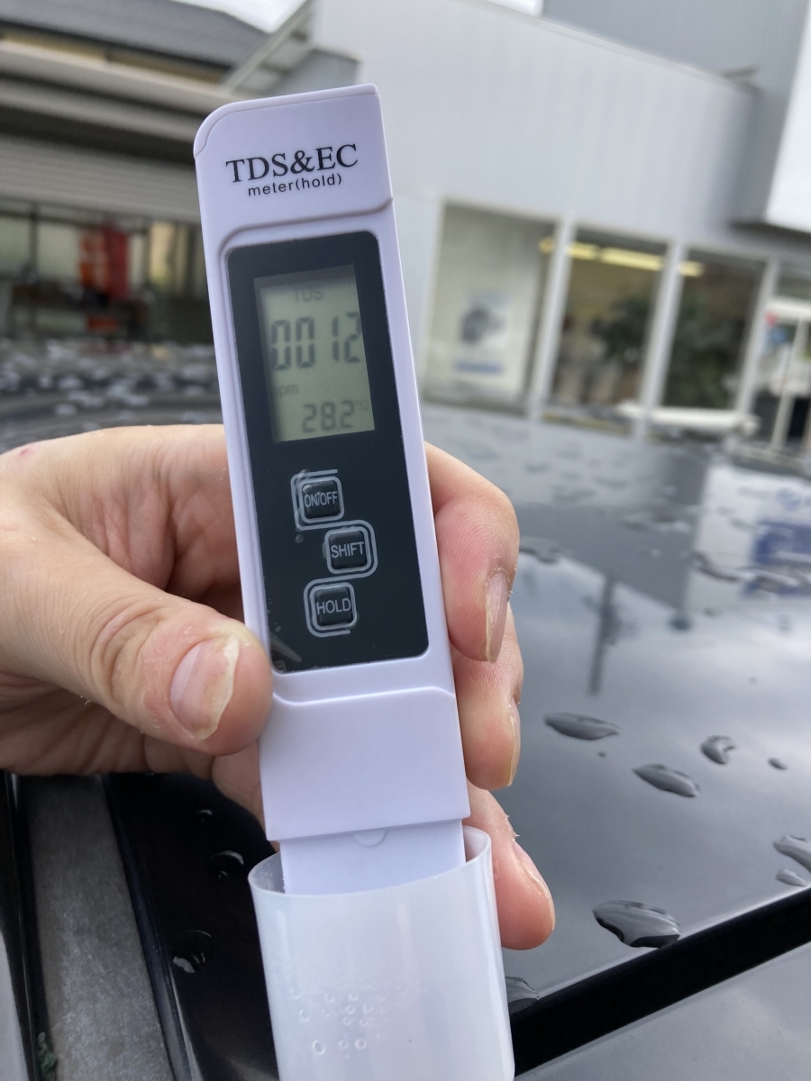 下部写真は、酒田の水道水の水質数値です。「36」ppm(日・時間により変動)から「純水器」を通して「0」ppmになり、純水になったのが確認出来ます。