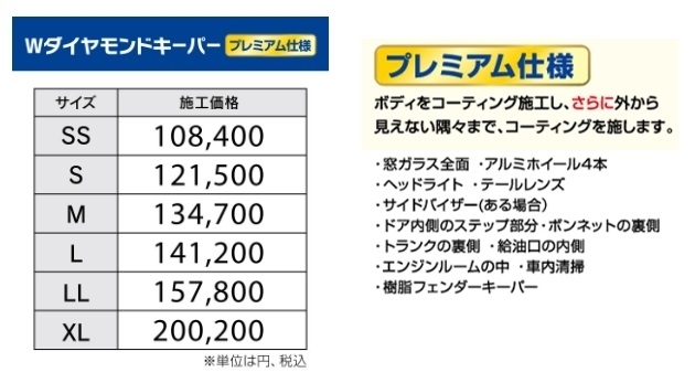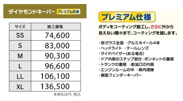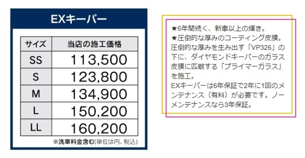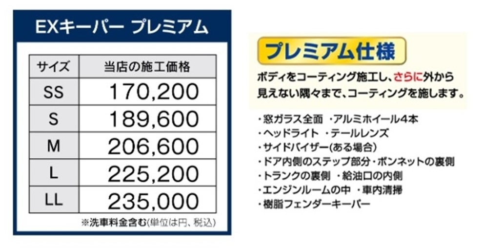 尚、最上級グレードの「EXキーパー」に関しては、「コーティング専用ブース完備」と、「コーティング技術EX1級資格」を取得しないと、取扱施工店として認められていない「今まで以上に高品質」なコーティングになっておりますので、お任せください。