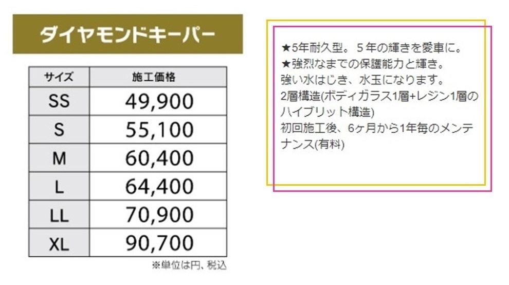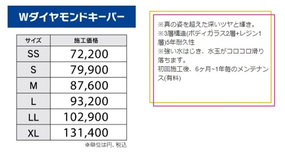 こちらも、ボディガラスコーティングになり、1年毎の再施工でお車をキレイを保てる商品となっております。