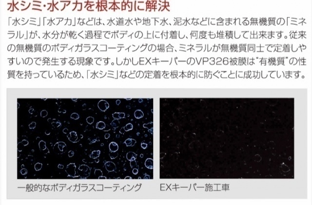 上部写真のように、塗装面に輪シミのように固着しているものについて、キーパー施工車でもこのようになり、水シミが付いたように見える車もありますが、実は「ミネラル」が固着(イオンデポジット)しても、このような状態になります。