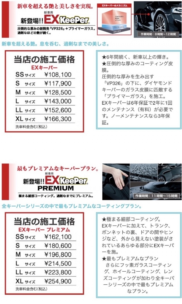 尚、最上級グレードの「EXキーパー」に関しては、「コーティング専用ブース完備」と、「コーティング技術EX1級資格」を取得しないと、取扱施工店として認められていない「今まで以上に高品質」なコーティングになっておりますので、お任せください。