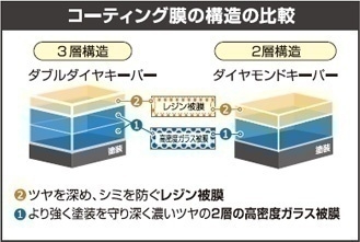 キーパーコーティングの中で唯一3層構造のWダイヤモンドキーパー。ガラス膜の2重構造でツヤの深みが違います。KeePerのガラス膜は他社の製品に比べて、とてもぶ厚い(他社製品の50倍のガラス膜の厚さ)ですが、さらに2重構造にすることにより、深いツヤが出ます。さらにレジン膜を上に塗布することで、ガラス膜の天敵、水シミから守ります!