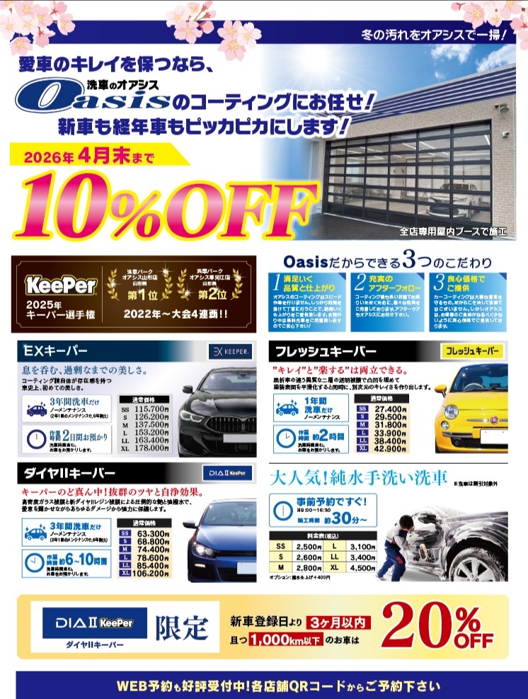 対象のボディコーティングが10%OFF、更に今人気急上昇中のコーティング「ダイヤⅡキーパー」が新車割引の仲間入り😀