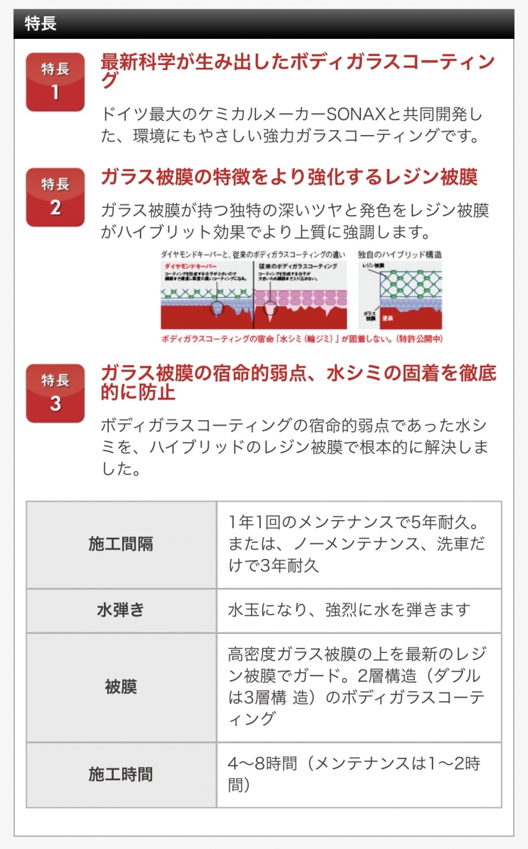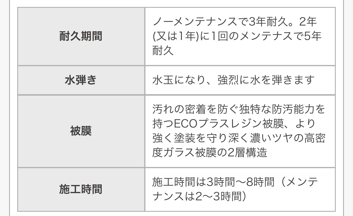 ・フッ素ガラスコーティングの耐久性は3ヶ月から6ヶ月。施工時間は15分からですが、油膜取りの作業から、フッ素コーティング、乾燥、拭き取りという工程をキッチリ行うと30分程いただきます。