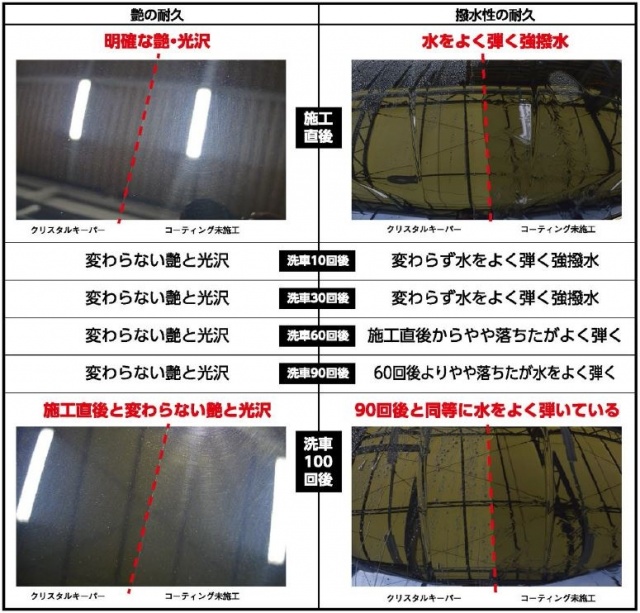 車の半分にクリスタルキーパーを施工。ドライブスルー洗車機のシャンプー洗車で、10回ごとに「艶」と「撥水」の状態を観察しながら、100回連続で洗車した。
