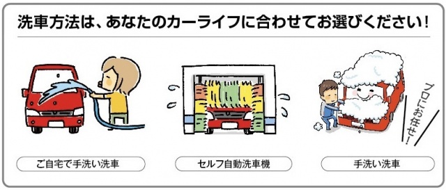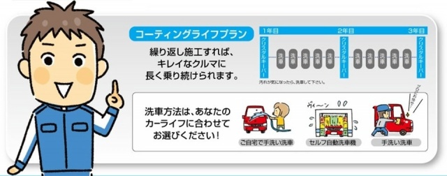A・洗車機での洗車も、お客様ご自身で洗って頂いても、全く問題ありません。できれば洗車後の拭き上げをお願いします。水道水にはミネラルが多く含まれる為、そのまま乾くとシミの原因となります。効果をしっかり発揮する為にシャンプーを使う場合は、コーティング剤や、コンパウンドの入っていないものをご使用下さい。